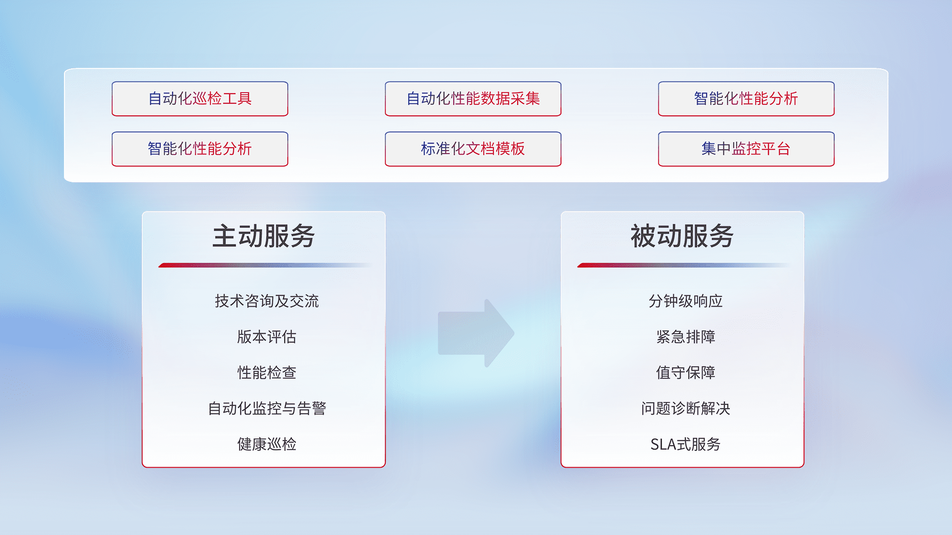 智能化工具和标准化文档,,保障服务质量,,,提供主动服务(包含技术咨询、、、版本评估、、性能检查、、、自动化监控与告警、、健康巡检)和被动服务包含(分钟级响应、、紧急排障、、、值守保障、、问题诊断解决、、SLA服务)。。。。